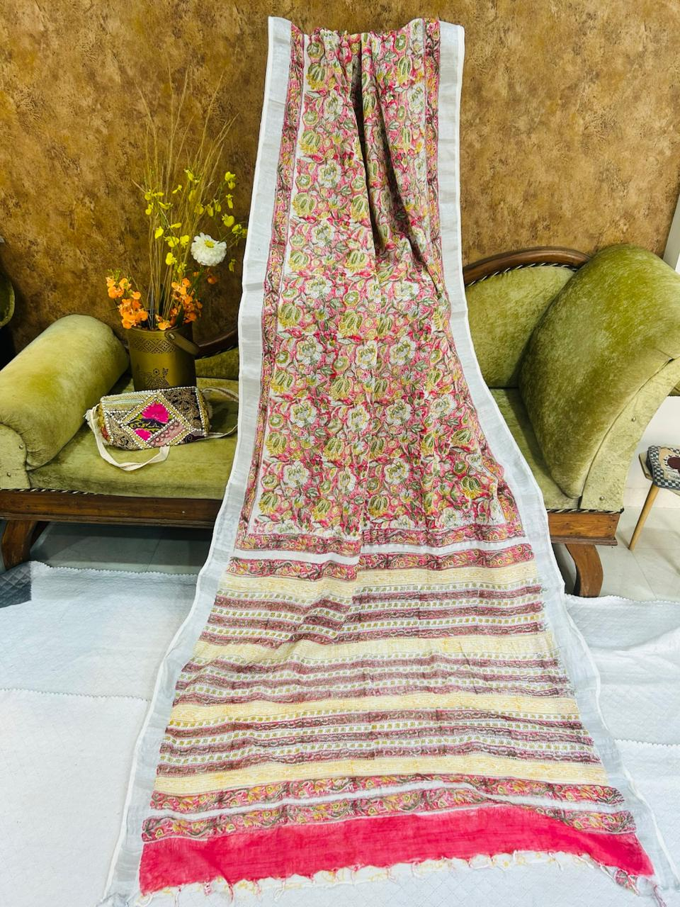 Product Name Floral Printed White Multicolor Linen Saree